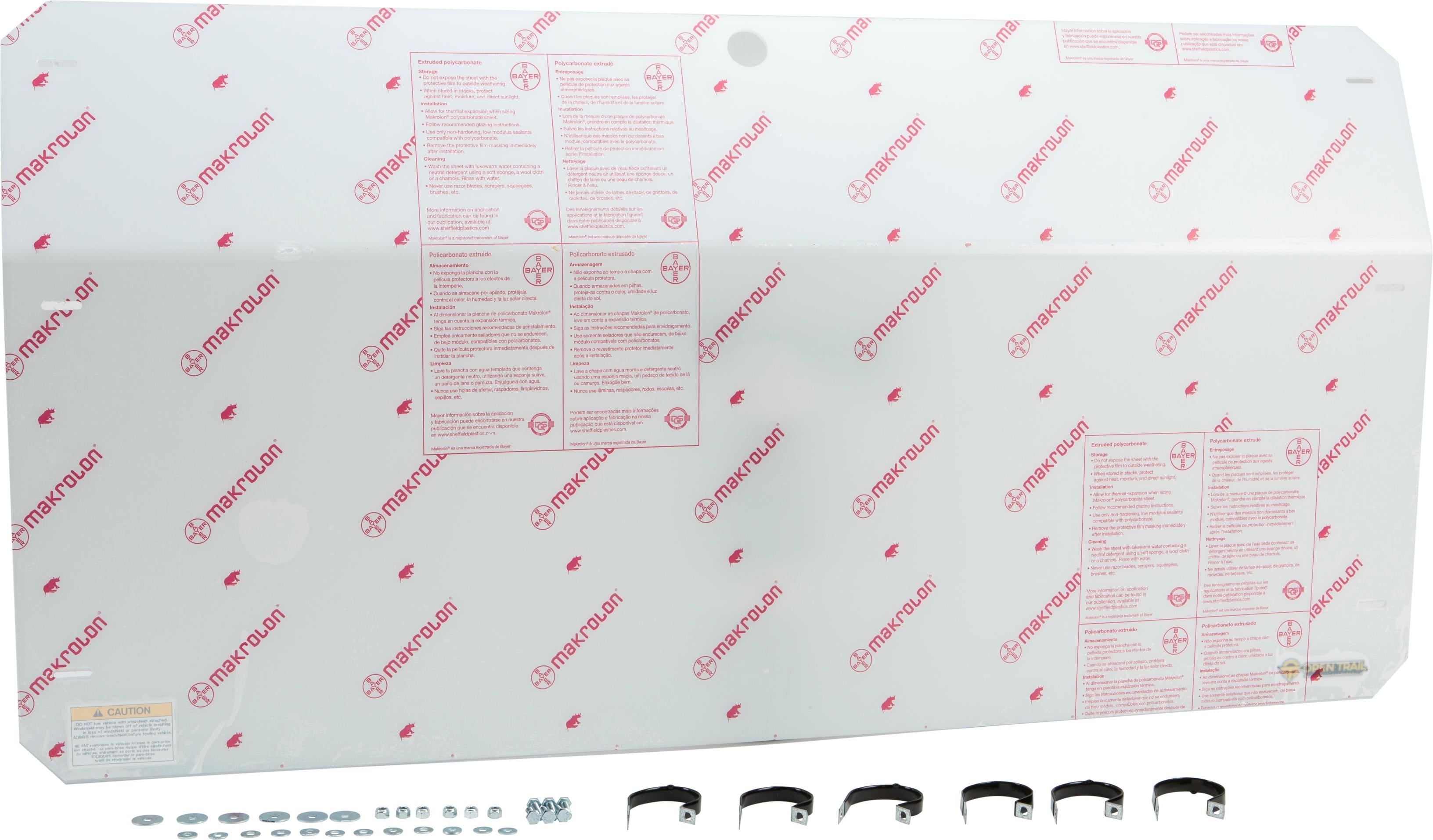 The open trail full windshield is made with ultra durable 0.177" makrolon® polycarbonate for long lasting, high strength protection and a clear view of the trail.This windshield works with the open trail roof as well as the oem roof.The windshield has a seal at the bottom that rests against your vehicle.It is attached to your roll bars using six galvanized steel, rubber coated p clamps that are bolted to the windshield through pre-drilled holes.