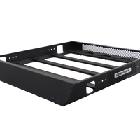 Galvanized steel fabricated panels, Extruded aluminum cross bars, Injection molded Nylon cross bar end caps attach the cross bars securely to the fabricated side panels, Integrated side light mounts for standard cube stem mount LED lights, Integrated hole pattern for standard scene light mounts - two sets per side, Solid front fairing reduces wind noise while vented rear cover allows for air to escape reducing noise from turbulence, Front fairing and rear cover are removeable exposing multiple mounting hole patterns for a variety of lighting styles, Removeable front fairing and rear cover allow for storage of larger items such as paddle boards and kayaks, etc., Aluminum cross bars include a four-core extruded track system that works with any 1/4-20 hex bolt, Universal U bolt style mounting clamp system included, Modular construction allows the rack to ship via parcel (UPS/FedEx), Texture black powdercoat