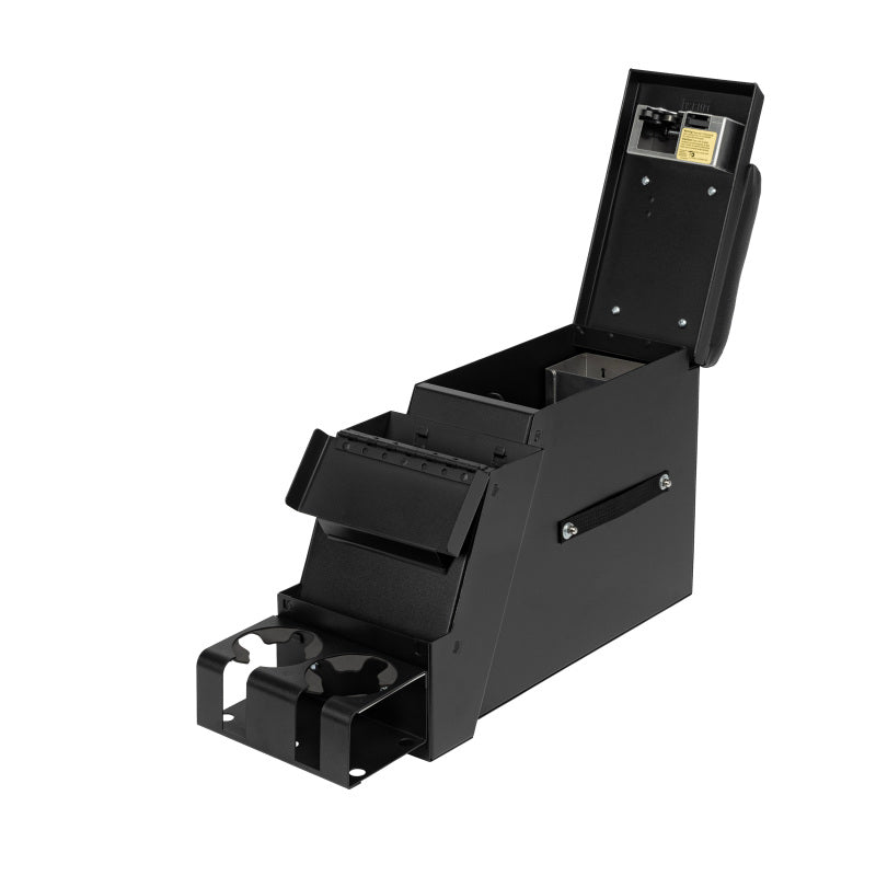 This convenient 6 1/2 inch wide, 16 gauge steel security console features Tuffy*s patented pushbutton latch system. For safety and convenience while operating the vehicle, the lid also latches closed without having to be locked. It has 2 compartments, a separate compartment for mounting a stereo, CB Radio, or other electronic equipment, and a lockable rear storage space lined with a rubber floor mat. The spacious rear compartment accommodates a CD changer, tools, and other valuables. Other accessories are also available.