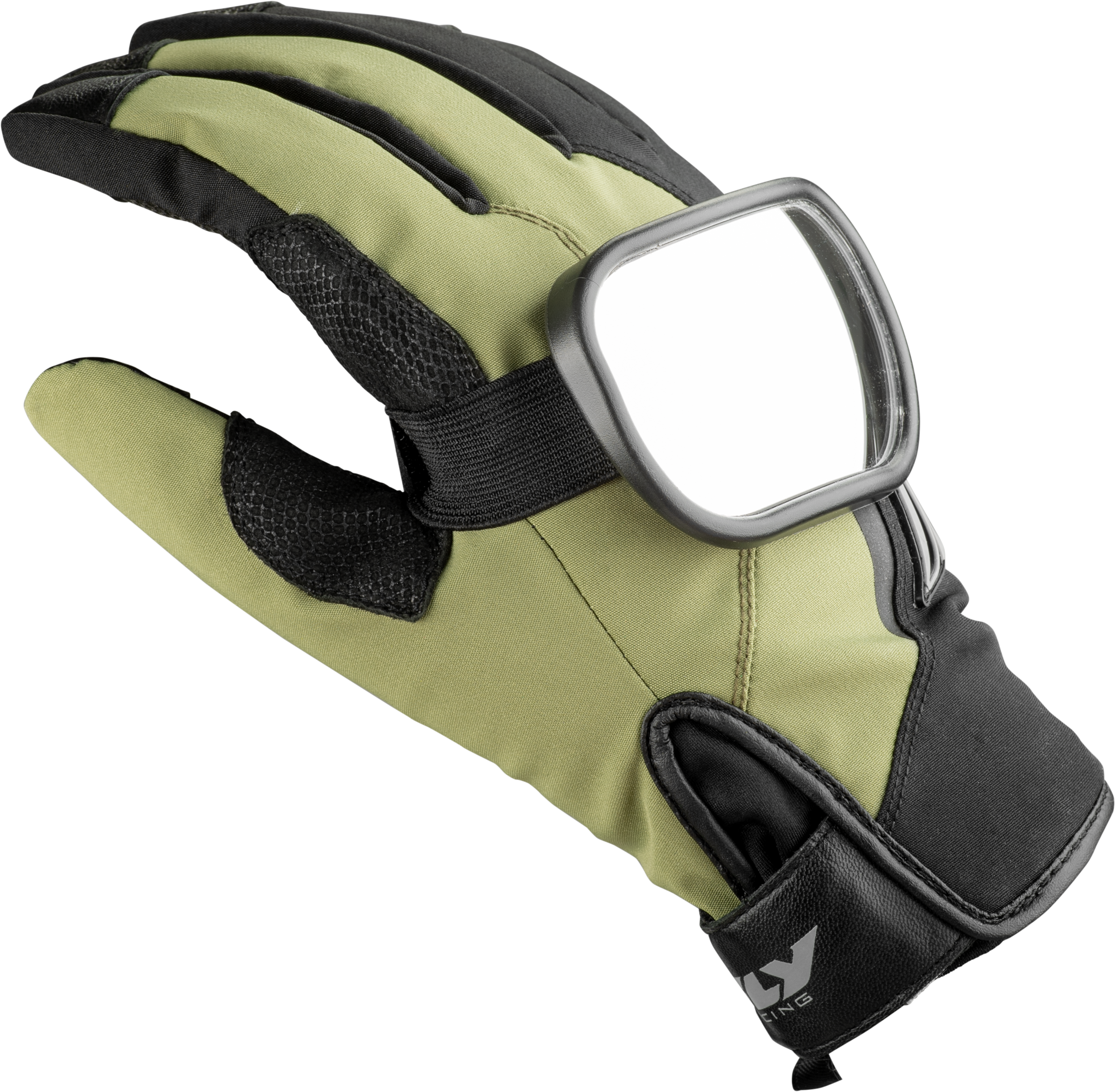 Mirror attaches by velcro strap to back of glove or top of coat sleeve.